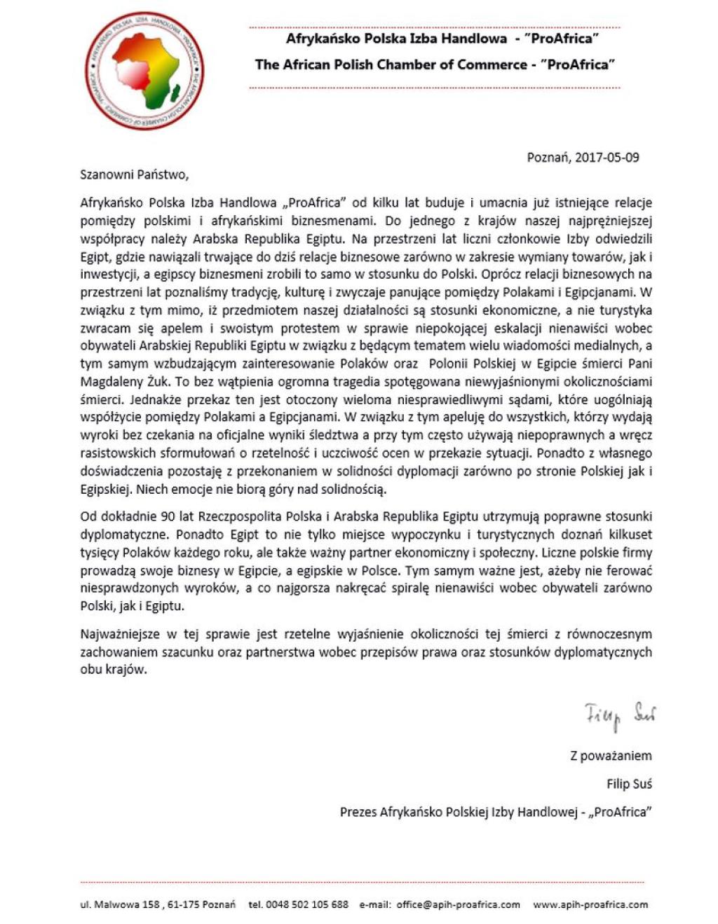 Apel - protest prezesa Afrykańsko-Polskiej Izby Handlowej ProAfrica w sprawie tematu tragicznej śmierci Magdaleny Żuk w Egipcie