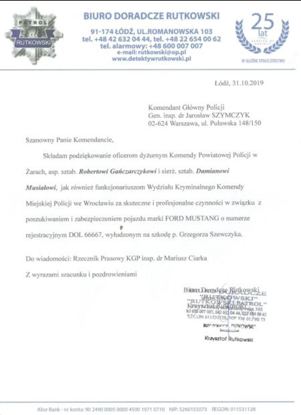 Oficjalnie Biuro Rutkowski skierowało na piśmie podziękowania za dzisiejszą akcję do Komendanta Głównego Policji. Pismo w tej sprawie zostało przekazane na ręce Mariusza Ciarki, Rzecznika Prasowego Komendanta Głównego Policji w Warszawie.