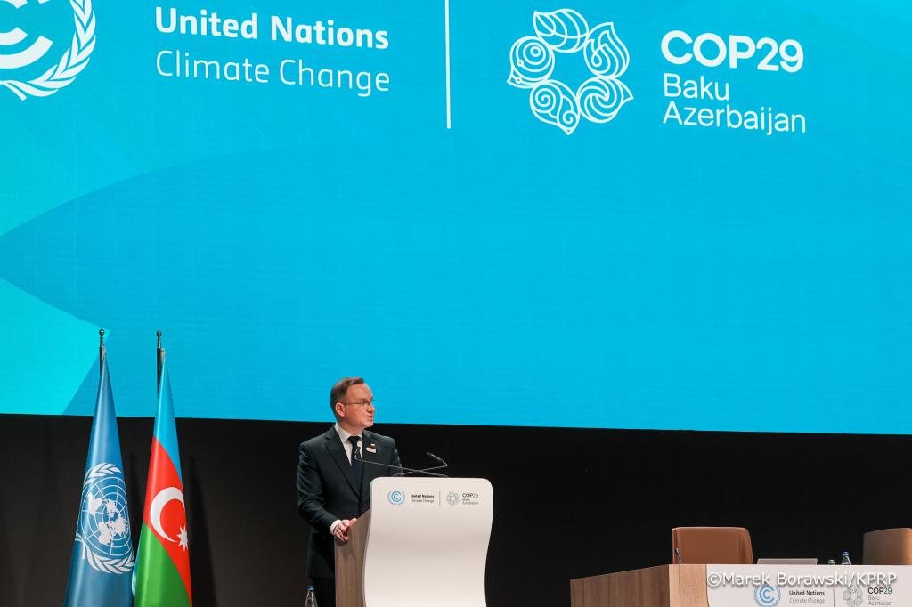 Polski model transformacji energetycznej oparty o atom, ale też uwzględniający jej ludzki wymiar był głównym tematem wystąpienia Prezydenta RP Andrzeja Dudy na rozpoczętej dziś konferencji klimatycznej COP29 w stolicy Azerbejdżanu.