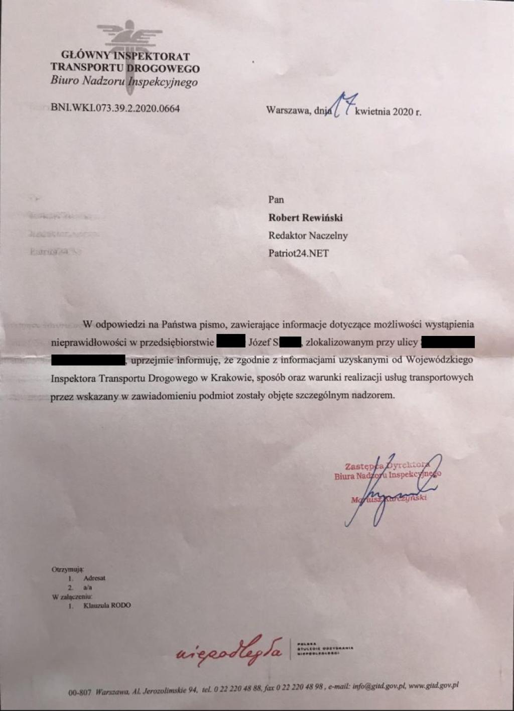 O tym bezprawiu alarmowaliśmy w kwietniu br. Głównego Inspektora Transportu Drogowego Alvina Gajadhura. W piśmie z 17 kwietnia 2020 r. zapewnił naszą redakcję, że konktowersyjna firma znajdzie się pod "szczególnym nadzorem".