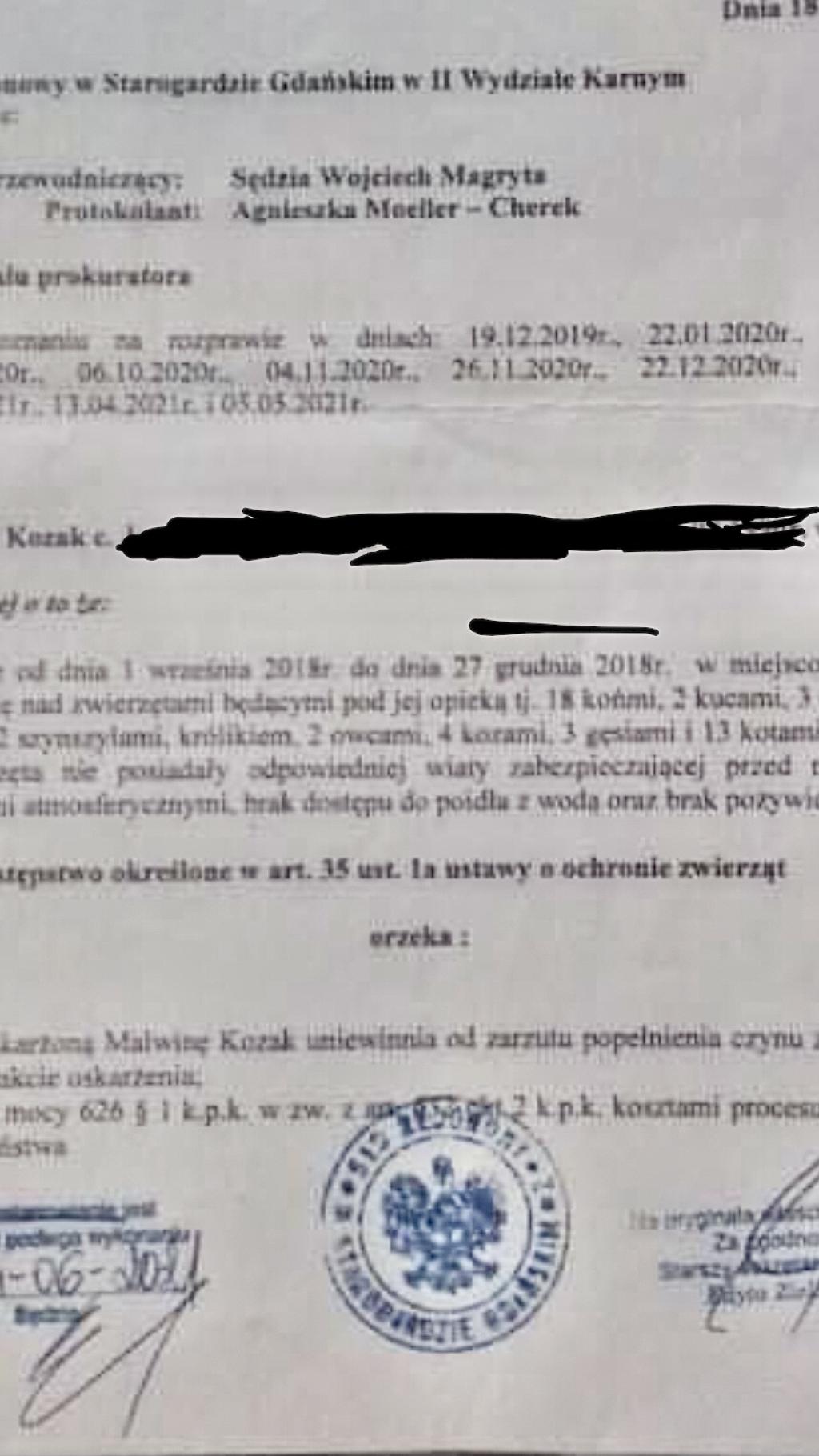 Kobieta została oskarżona o ich zaniedbywanie i narażenie na niebezpieczeństwo. Ale sąd prawomocnie uniewinnił kobietę od tych zarzutów. I nakazał zwrot wszystkich zwierząt.