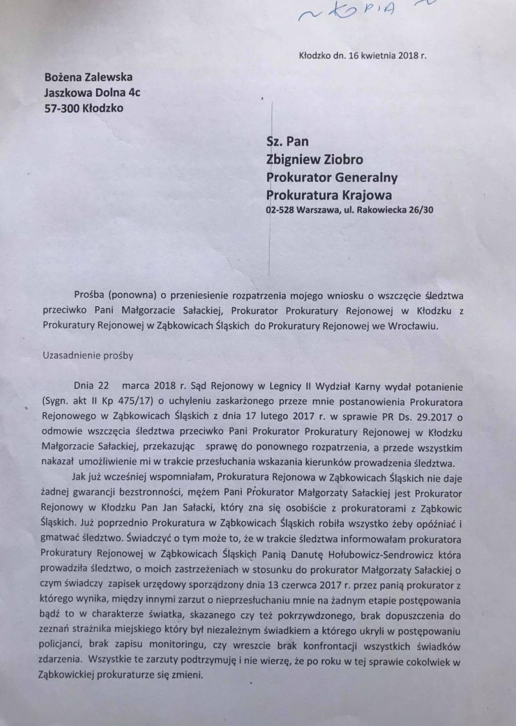 Sąd w Legnicy zdecydował o kontynuowaniu działań prokuratury w Ząbkowicach Śląskich celem ścigania prokurator Małgorzaty Sałackiej za niedopełnienie obowiązków, których skutkiem było postawienie przed Sądem Rejonowym w Kłodzku i skazanie miejscowej pracodawczyni Bożeny Zalewskej. Ale w Ząbowicach Śląskich wczoraj biznesmenka dowiedziała się, że sprawę będzie na jej wniosek i po interwencji Ministra Zbigniewa Ziobro, rozpatrywać Prokuratura Rejonowa we Wrocławiu!