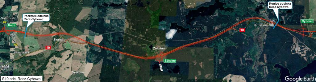 Trasa rozpocznie się za węzłem drogowym Recz, który powstanie na sąsiednim odcinku i przebiegać będzie na początku na północ od istniejącej DK10. Na wschód od Słutowa S10 pobiegnie przy istniejącej DK10. Na połączeniu z drogą powiatową w rejonie Żółwina zlokalizowany będzie węzeł drogowy. Trasa pobiegnie następnie na południe od linii kolejowej przechodząc na północną jej stronę w rejonie Prostyni. Odcinek realizacyjny zakończy się około kilometra za mostem na Drawie przed węzłem drogowym Cybowo.