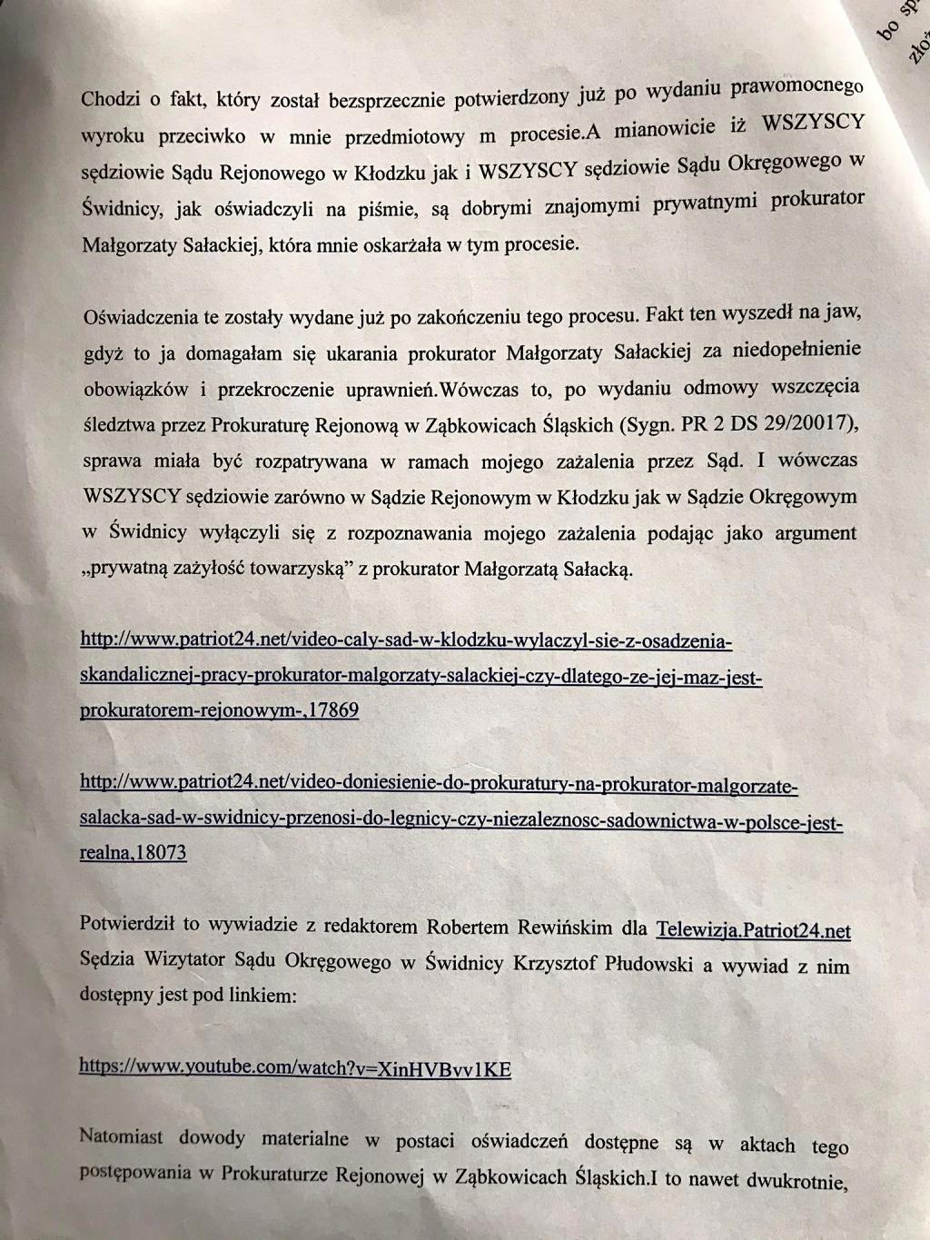 Oświadczenia to potwierdzające każdy sędziów zarówno z Kłodzka jakiś Świdnicy 2-krotnie złożył do akt postępowania prokuratorskiego w Ząbkowicach Śląskich. Bo tam Bożena Zalewska złożyła zawiadomienie o możliwości popełnienia przestępstwa przez prokurator polegającą na niedopełnienie obowiązków i przekroczenie uprawnień. A sędziowie złożyli te oświadczenia wycofując się z rozpoznawania sądowego zażalenia na umorzenie tego postępowania.