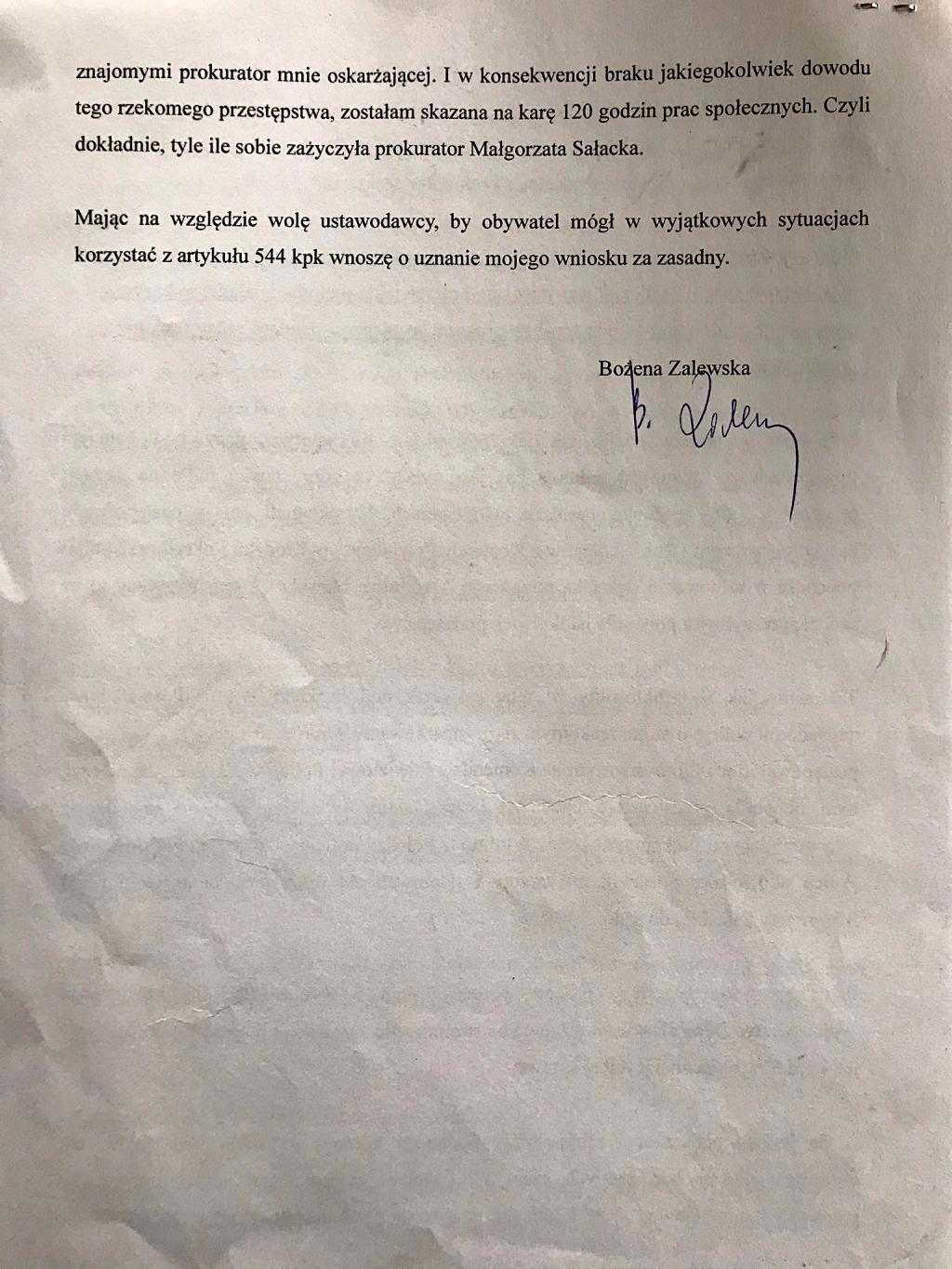 Bożena Zalewska wystąpiła do Sądu Apelacyjnego z wnioskiem o wznowienie całego postępowania po rekomendacji Rzecznika Praw Obywatelskich.